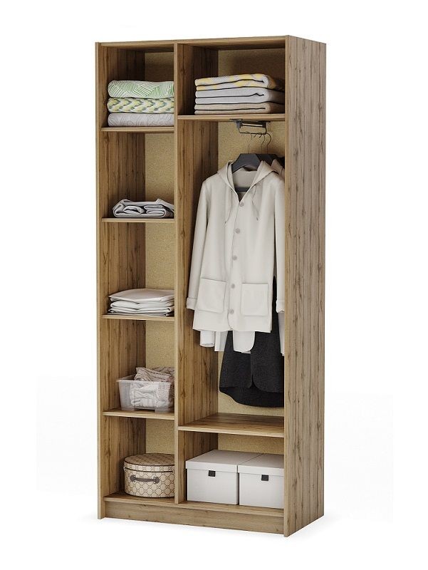 Вместительный шкаф с перегородкой. Одна секция шкафа представляет собой отдел с полками, а во второй расположена выдвижная штанга под одежду.
